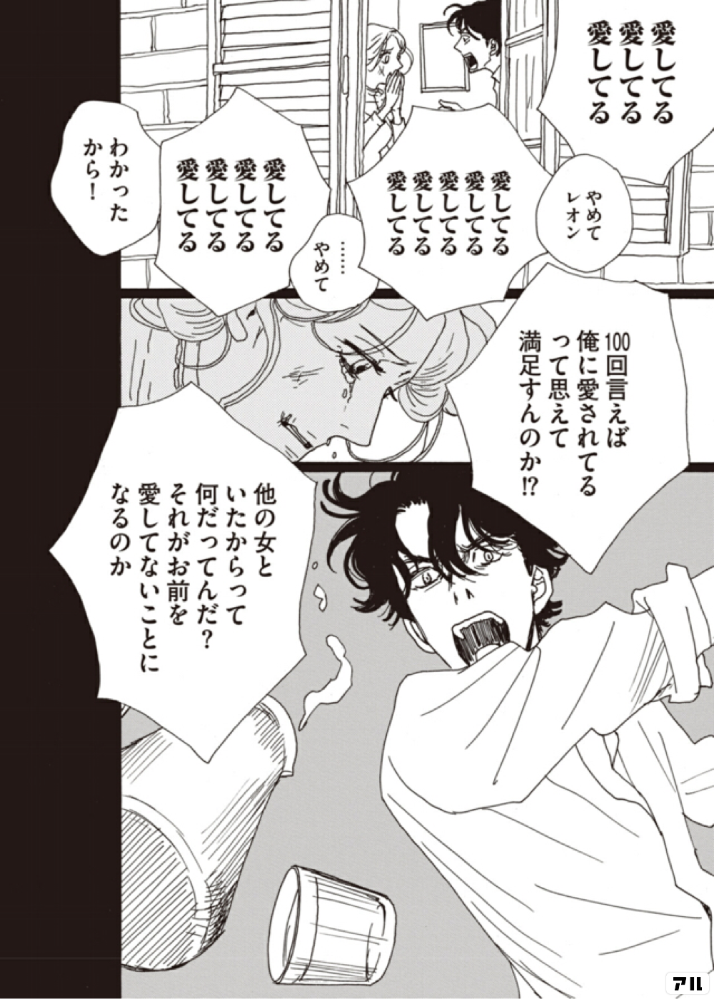 愛してる愛してる愛してる やめてレオン 愛してる愛してる愛してる愛してる愛してる やめて 愛してる愛してる愛してる愛してる わかったから 100回言えば 俺に愛されてるって思えて 満足すんのか 他の女といたからって 何だってんだ それがお前を 愛してないことに